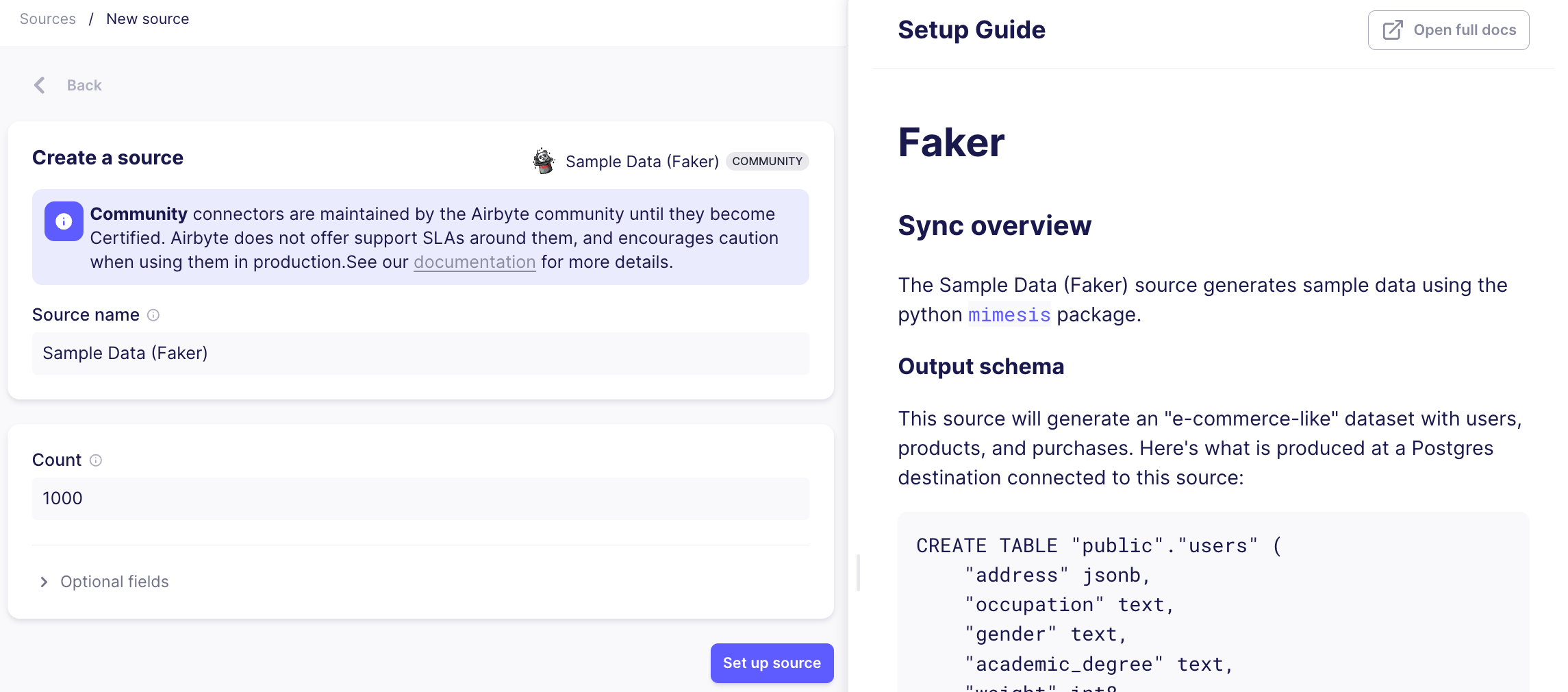 Each connector in Airbyte will have its own set of authentication methods and configurable parameters. In the case of Sample Data (Faker), you can adjust the number of records you want returned in your Users data, and optionally adjust additional configuration settings. You can always refer to your source's provided setup guide for specific instructions on filling out each field.